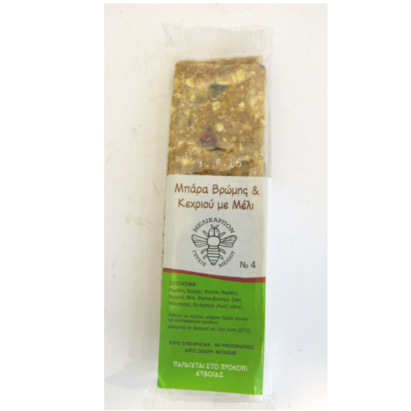 Μπάρα με νιφάδες βρώμης και νιφάδες κεχριού, φυστίκια, μέλι, φυστικοβούτυρο, σύκα, ηλιόσπορο και κράνμπερυ.