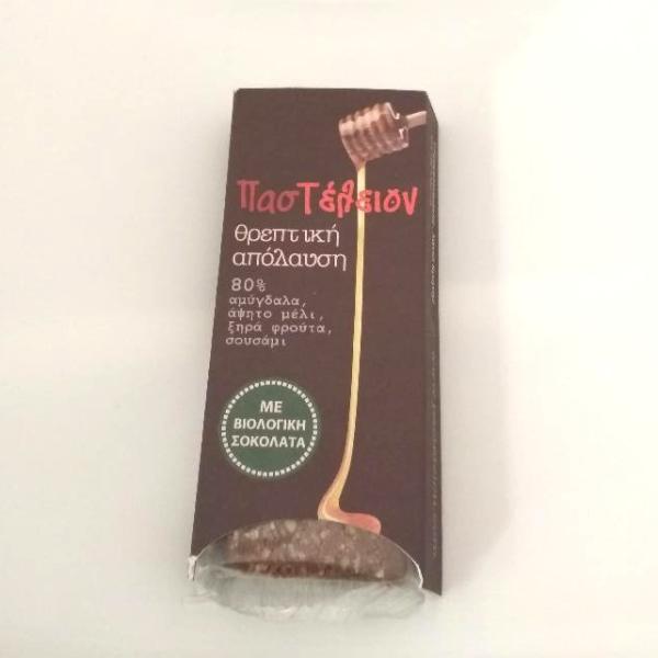 Περιέχει 80% αμύγδαλα, μέλι, ξηρά φρούτα, σουσάμι και 20% βιολογική σοκολάτα.
