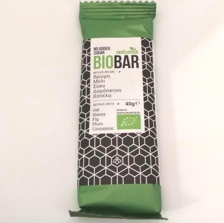 Βιολογική μπάρα με βρώμη, μέλι, σύκο, δαμάσκηνο και κανέλα. Χωρίς προσθήκη ζάχαρης.
