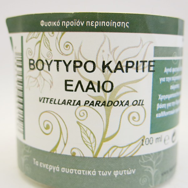 Vitellaria paradoxa oil. Το βούτυρο καριτέ εξάγεται από τον καρπό ενός αιωνόβιου δέντρου της Αφρικής. Έχει υψηλή περιεκτικότητα σε φυτικά λιπαρά, κάτι που του προσδίδει καταπληκτικές ενυδατικές ιδιότητες, ενώ παράλληλα είναι πλούσιο σε βιταμίνες A, D, E, και F. Η χρήση του αυξάνει την ελασ...